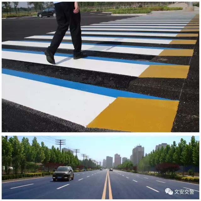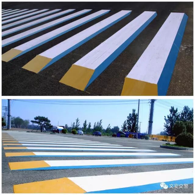 与传统的白色斑马线相比,这种彩色立体斑马线通过蓝白黄三色相间彩条,使平面的斑马线呈现立体感,在喷涂材料中还加了微小的玻璃珠,能起到反光作用,即使晚上也能清楚看见。